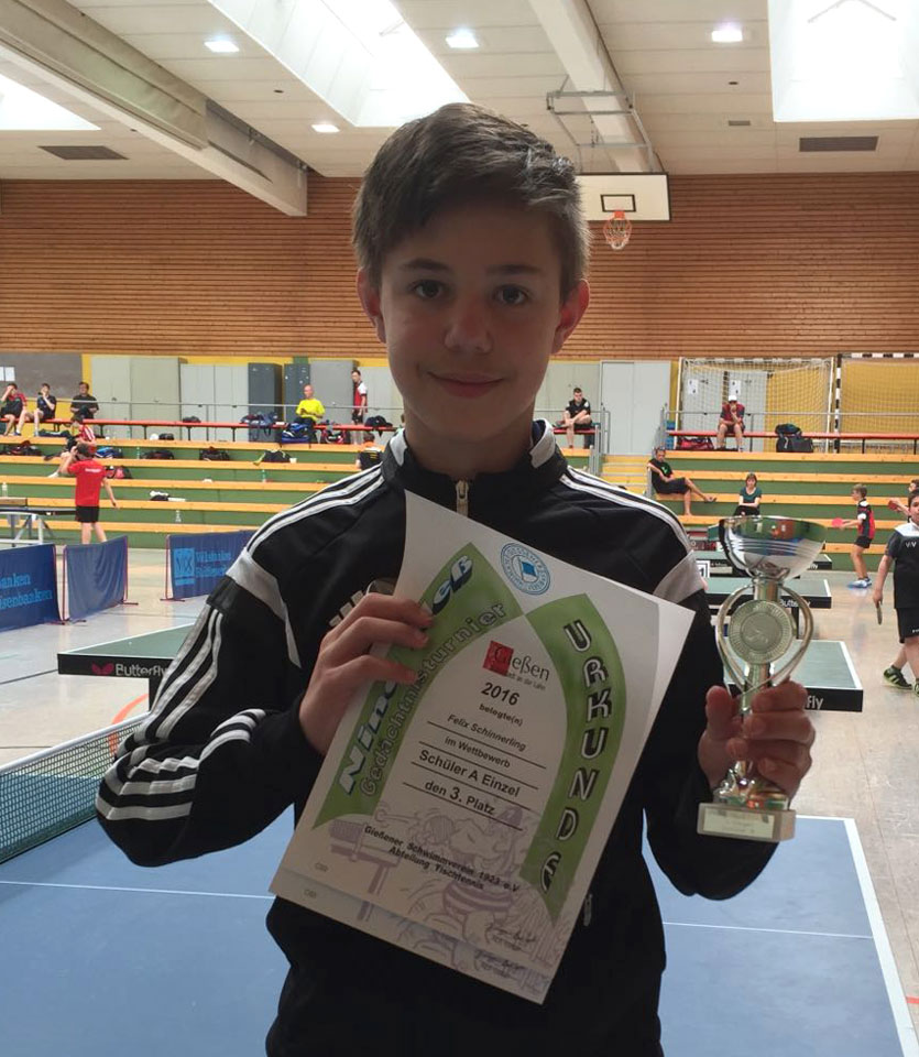 Felix konnte sich in seiner 4er Gruppe ungeschlagen mit 3:0 Siegen (3:0, 3:1, 3:0) durchsetzen und zog als Gruppenerster somit in die Endrunde ein. Im Viertelfinale konnte sich Felix knapp mit 3:2 durchsetzen. Im Halbfinale hatte er dann leider bei einer knappen 2:3 Niederlage das Nachsehen, konnte sich aber trotzdem über seinen 3. Platz freuen.